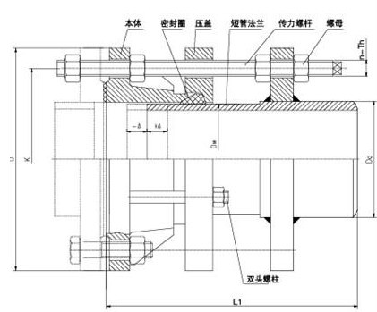 雙法蘭傳力接頭:由本體,密封圈,壓蓋,伸縮短管等主要部件組成。該產品適用于兩邊均為法蘭連接的管道中,安裝時調節產品兩端的法蘭的安裝長度,對角均勻擰緊壓蓋螺栓,使其成為一個整體,并有一定的調節量,方便安裝維修時,根據現場尺寸進行調整。在工作時可以反軸向推力傳遞至整個管道。適用于輸送海水、淡水、冷熱水、飲用水、生活污水、原油、燃油、潤滑油、成品油、空氣、煤氣、溫度不高于250度的蒸汽和顆粒粉狀等介質。